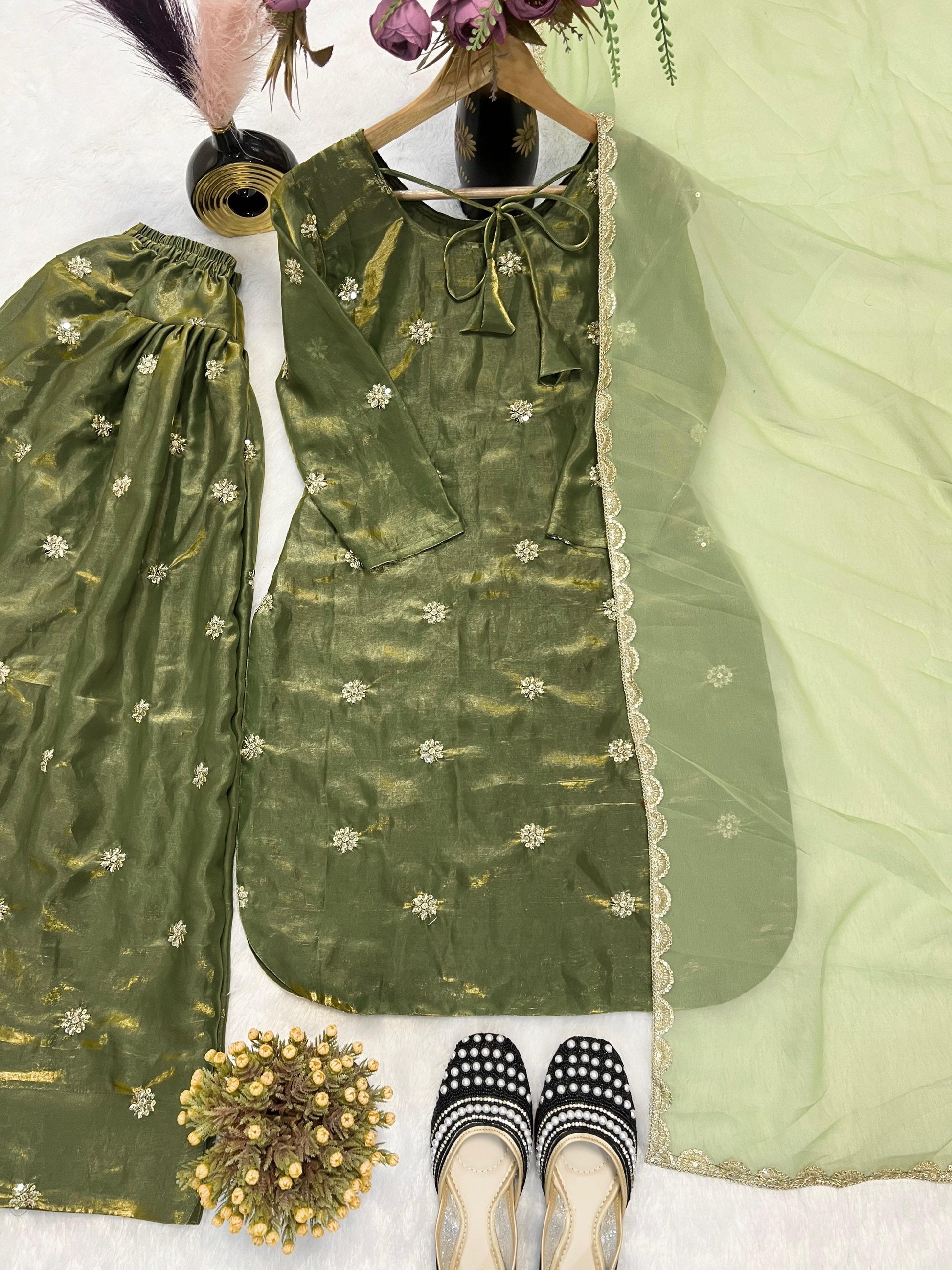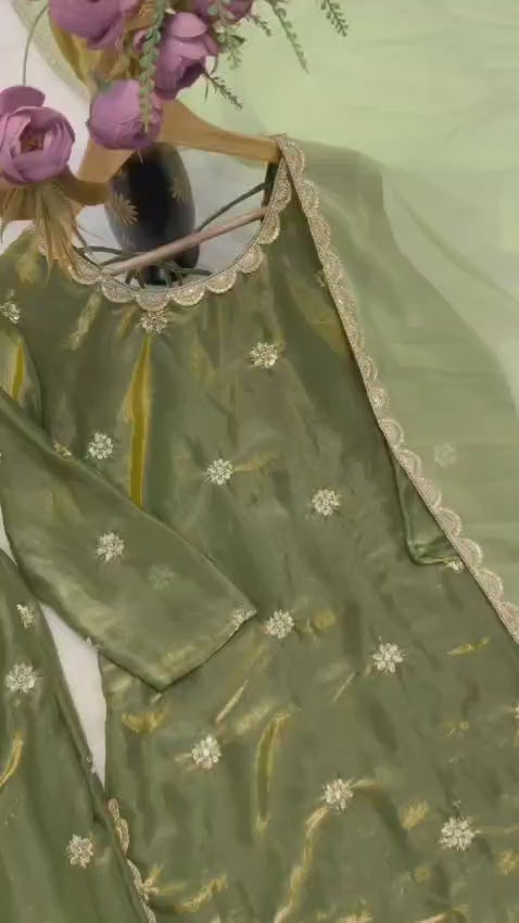 *Farshi salwar Fabric*: Heavy Fandy Crushi Silk Embroidery Sequence Work.