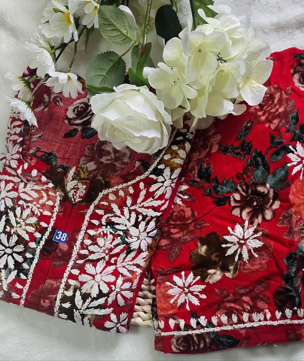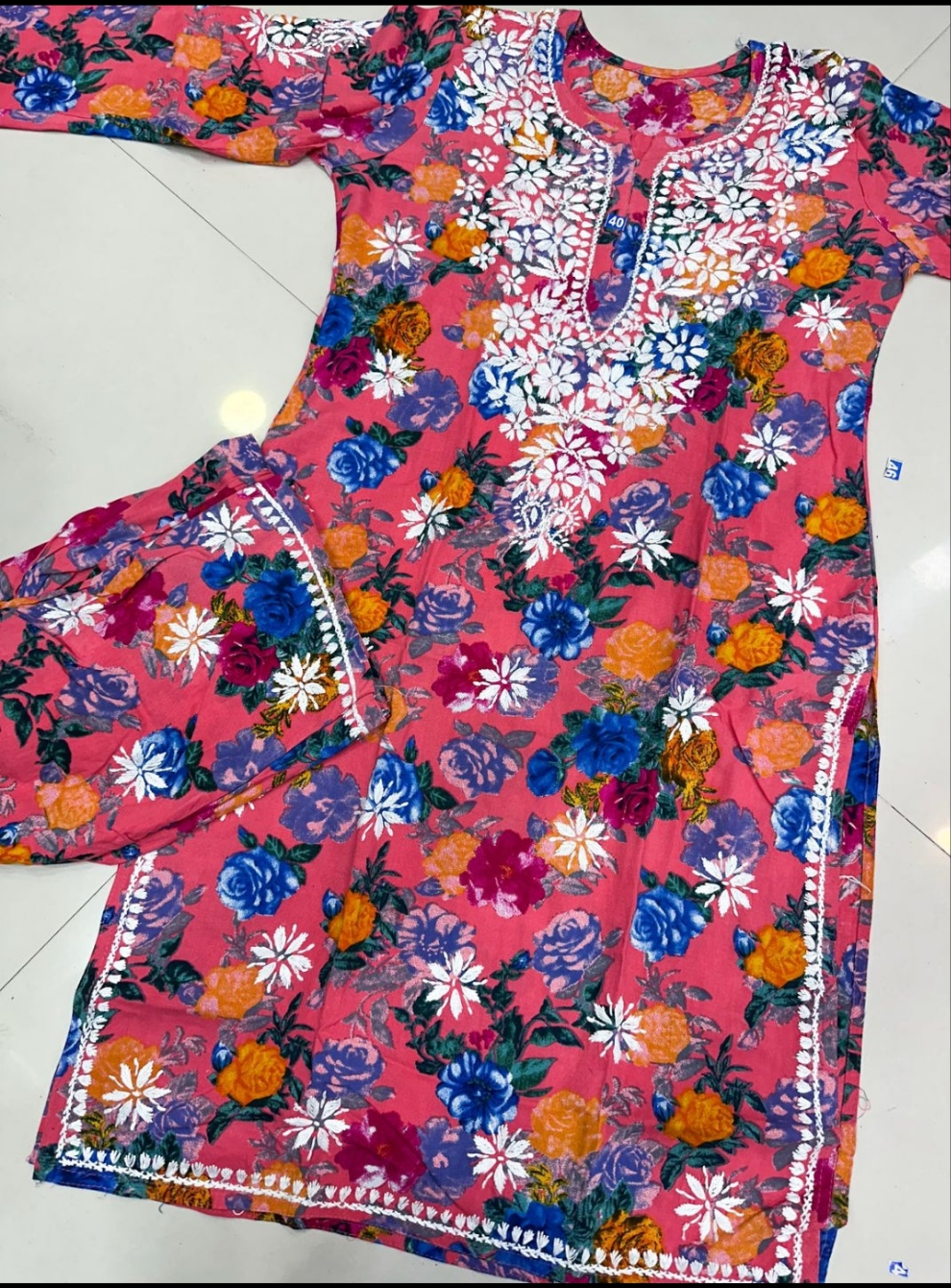 Chikankari hand embroidered women's floral tunic and trouser set, it's crafted from rayon fabric and adorned with intricate Lucknowi Chikankari embroidery. Perfect for summers ☀️